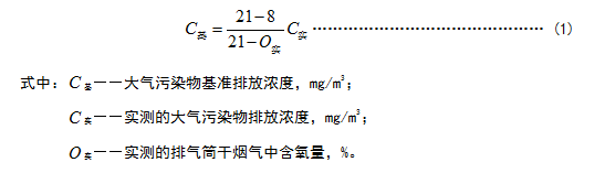 1.4 對(duì)于玻璃熔窯排氣(純氧燃燒除外),應(yīng)同時(shí)對(duì)排氣中含氧量進(jìn)行監(jiān)測(cè),實(shí)測(cè)排氣筒中大氣污染物排放濃度應(yīng)按式(1)換算為含氧量為8%狀態(tài)下的基準(zhǔn)排放濃度,并以此作為排放是否達(dá)標(biāo)的依據(jù)。其他車(chē)間或生產(chǎn)設(shè)施排氣按實(shí)測(cè)濃度計(jì)算,但不得人為稀釋排放。