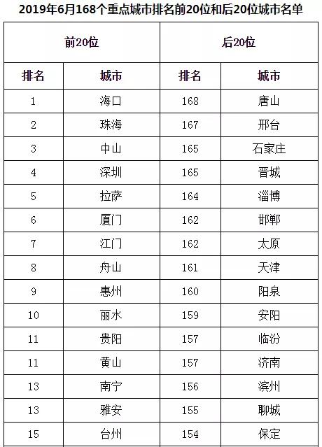 2019年6月,168個重點城市中唐山、邢臺、石家莊市等20個城市空氣質(zhì)量相對較差(從第168名到第149名);???、珠海、中山市等20個城市空氣質(zhì)量相對較好(從第1名到第20名,見附表1)。