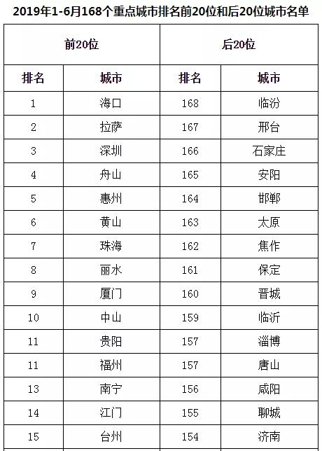 2019年1-6月,168個重點城市中臨汾、邢臺、石家莊市等20個城市空氣質(zhì)量相對較差(從第168名到第149名);海口、拉薩、深圳市等20個城市空氣質(zhì)量相對較好(從第1名到第20名,見附表2)。