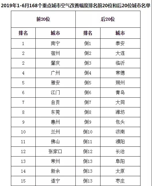 從空氣質(zhì)量同比改善程度看,2019年1-6月,168個重點城市中南寧、宿州、肇慶市等20個城市空氣質(zhì)量改善幅度相對較好(從第1名到并列第19名);泰安、大連、臨沂市等20個城市空氣質(zhì)量改善幅度相對較差(從倒數(shù)第1名到倒數(shù)第20名,見附表3)。